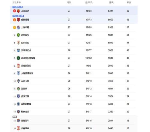 北京时间10月18日晚,中超第27轮比赛结束3场角逐!客场作战的山东泰山队2-2战平浙江队,无欲无求的津门虎0-2不敌云南玉昆队;而北京国安队则爆出大冷门,他们1-2输给深圳新鹏城。这3场赛事结束后,中超积分榜的争冠和保级形势基本上明朗了:3队成降级热门,1队退出争冠!