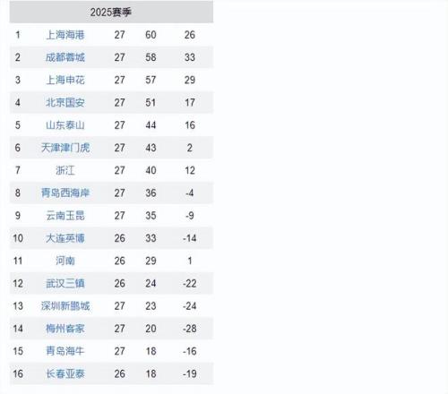 中超最新积分榜