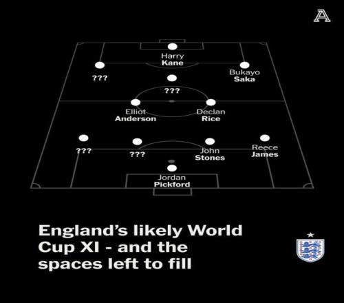 据The Athletic报道称,英格兰队世界杯7个首发位置已确定,贝林厄姆、帕尔默、福登等球员将竞争10号位首发。
