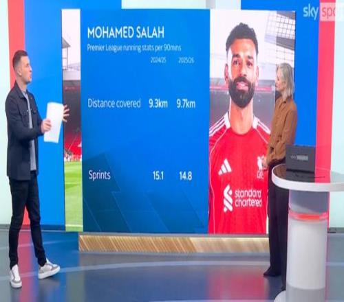 据《天空体育》的数据统计,萨拉赫上赛季英超每90分钟跑动9.3公里,场均冲刺15.1次,本赛季至今,每90分钟跑动9.7公里,冲刺14.8次。
