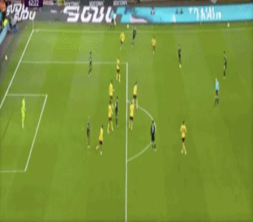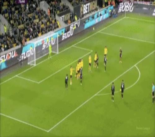 第45+2分钟,沃尔费禁区左侧倒三角传球,贝莱加德中路铲射破门,1-1!狼队扳平。