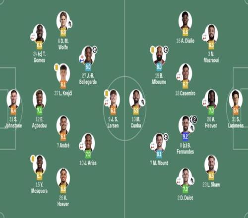 曼联(3421):31-拉门斯;3-马兹拉维(69’6-利马),26-海文(69’15-约罗),23-卢克肖;16-迪亚洛,18-卡塞米罗(78’37-梅努),8-B费,2-达洛特(85’13-多古);18-姆伯莫,7-芒特(85’11-齐尔克泽);10-库尼亚