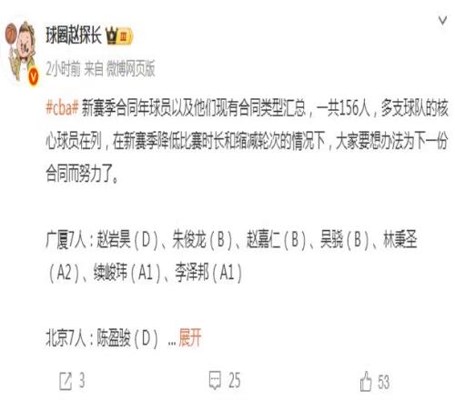 CBA新赛季将在12月12日拉开帷幕,根据媒体人球圈赵探长统计,新赛季有156位球员处在合同年,其中包括郭艾伦、陈盈骏、付豪、阿不都等13位顶薪球员,有5队有多达11人处在合同年,分别是上海、同曦、深圳、江苏与宁波。