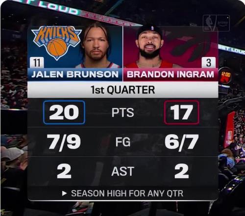 首节开场两队的核心人物对轰,两人都打满12分钟,布伦森9中7+6中4拿到20分2助攻,英格拉姆7中6+三分1中1拿到17分3篮板2助攻2抢断,英格拉姆在最后1分钟帮助猛龙领先结束首节。