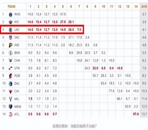 今天NBA迎来一场焦点对决,洛杉矶快船队客场113-115惜败火箭队,此役过后快船战绩跌至6胜19负排在西部倒数第二,全联盟排名倒数第三!熟悉NBA规则的小伙伴都应该明白,一支球队的战绩将最终决定该球队在下一个休赛期的选秀权位次。此役过后快船获得下个休赛期状元签概率达到了14%,与奇才、鹈鹕并列联盟第一,按照目前这种局面快船最差签位都跌不出联盟前7!