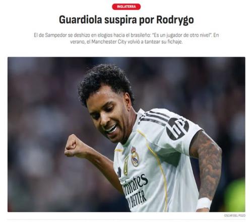 一直以来,瓜迪奥拉都非常欣赏罗德里戈。加盟皇马至今,罗德里戈在欧冠10次对阵瓜迪奥拉执教的曼城,贡献5球2助。2023-24赛季欧冠1/4决赛,皇马首回合3-3,次回合踢到加时点球5-4取胜,罗德里戈两回合都有进球。能突破,能进球,能回防,能压迫,这样的前锋,很符合瓜迪奥拉的喜好。