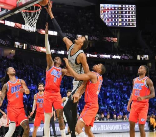 文班联合福克斯连续上分,不过杰威和卡鲁索很快追平。中段卡鲁索继续劈扣+上篮,卡斯尔带队反超比分后,亚历山大开始造犯规,文班亚马暴扣+瓦塞尔三分打停雷霆。杰威关键三分反超,文班亚马继续单打+抢篮板造杀伤。马刺拉开4分差距,最后1分钟,杰威继续打铁,文班亚马罚球不中给雷霆机会,亚历山大铁血追2分,卡斯尔两罚全中。雷霆最后10秒落后3分,两队点球战术,最终马刺111-109惊险击败雷霆,终结雷霆16连胜,马刺和尼克斯会师NBA杯决赛!