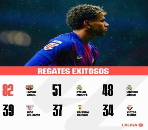 北京时间1月7日,西甲官方晒本赛季成功过人榜:亚马尔高居榜首,姆巴佩位居次席。