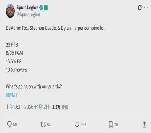 北京时间1月12日,NBA常规赛:马刺103-104不敌森林狼。此役过后,马刺27胜12负依然西部第二。森林狼26胜14负西部第四,领先第五湖人1个胜场。马刺今天输球,三后卫必须背锅,这哥仨投篮合计35中8,出现10次失误。
